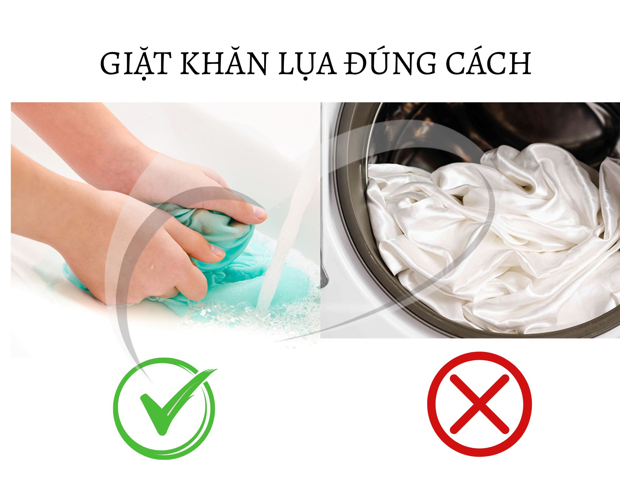 Khi giặt, hãy thao tác nhẹ nhàng, không vò mạnh hay vắt xoắn vì điều này có thể làm sợi lụa bị gãy hoặc biến dạng. Ngoài ra, không nên ngâm khăn quá 5 phút để tránh tình trạng bạc màu.