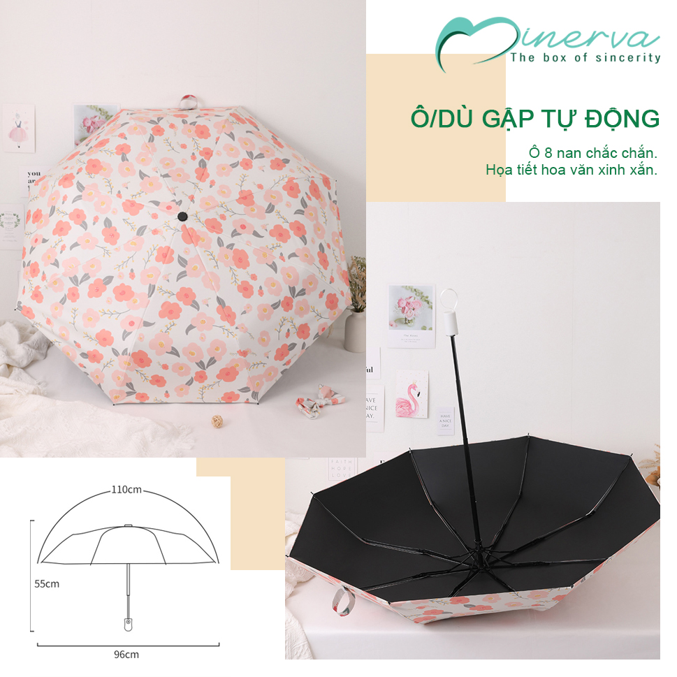Ô Minerva được thiết kế tiện lợi với cơ chế tự động gập/mở chỉ bằng một nút bấm, giúp bạn thao tác nhanh chóng, đặc biệt hữu ích trong những ngày mưa bất chợt hoặc khi đang mang nhiều đồ. Bên cạnh đó, cấu trúc 8 nan thép chắc chắn tăng cường độ bền và khả năng chịu lực, giúp ô không bị lật ngay cả khi gặp gió lớn – đảm bảo sự an tâm trong mọi điều kiện thời tiết.