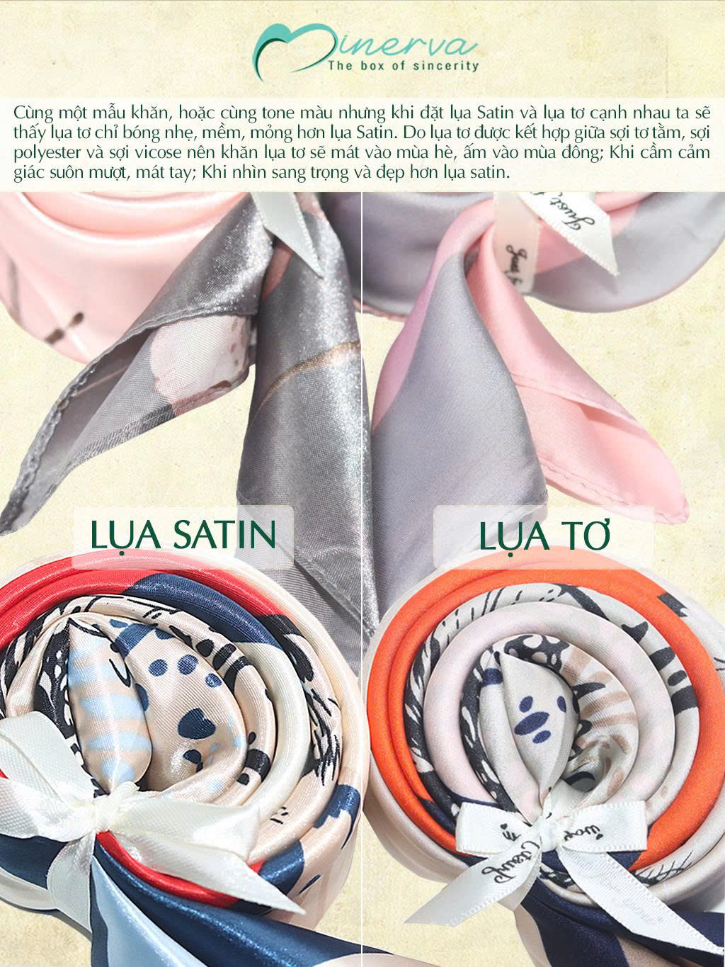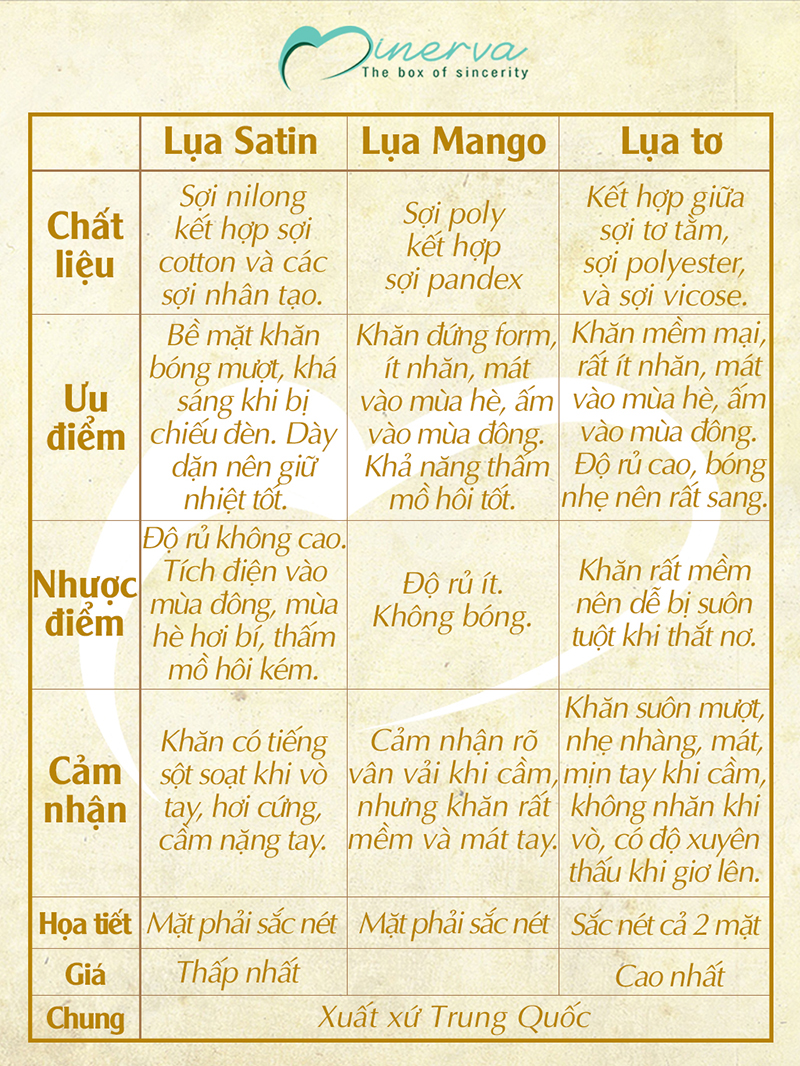 Chất liệu: lụa tơ, lụa Satin hoặc lụa Mango Hàn (Lưu ý: Chất liệu khăn cụ thể trong từng phân loại sản phẩm. Giá thành của mỗi chất liệu khăn cũng sẽ khác nhau)