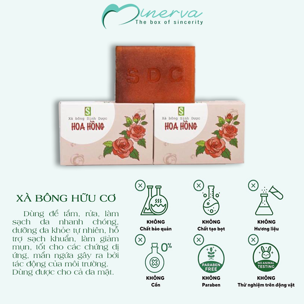 Xà bông sinh dược hoa hồng là sản phẩm thủ công thiên nhiên được sản xuất tại Ninh Bình, kết hợp tinh dầu hoa hồng dịu nhẹ cùng các thảo dược quý trong y học cổ truyền. Bánh xà bông có khả năng làm sạch sâu, hỗ trợ loại bỏ bụi bẩn, dầu thừa và vi khuẩn, đồng thời giúp làm dịu các vấn đề về da như mụn, viêm nhẹ, dị ứng hay mẩn ngứa. Nhờ thành phần lành tính, sản phẩm dưỡng ẩm tốt, mang lại làn da mềm mịn và khỏe mạnh. Hương thơm hoa hồng tự nhiên giúp thư giãn mỗi khi sử dụng. An toàn cho cả mặt và toàn thân, xà bông không chứa chất bảo quản, chất tạo bọt, hương liệu nhân tạo, cồn, paraben và không thử nghiệm trên động vật – là lựa chọn chăm sóc cơ thể nhẹ dịu, thân thiện với làn da và môi trường.