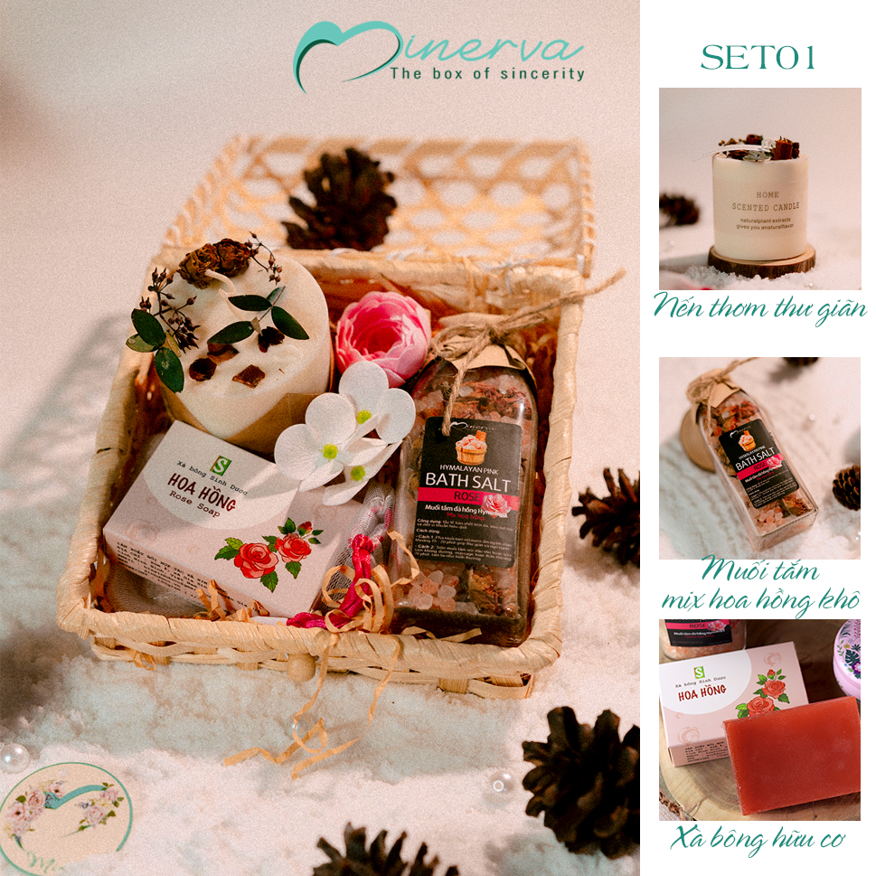 Hộp quà kết hợp thiên nhiên: Xà bông sinh dược, nến thơm, trà hoa, muối tắm,.. – những sản phẩm vừa chăm sóc sức khỏe, vừa tạo nên trải nghiệm thư giãn trọn vẹn.