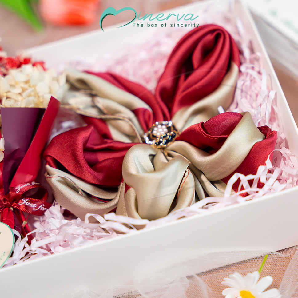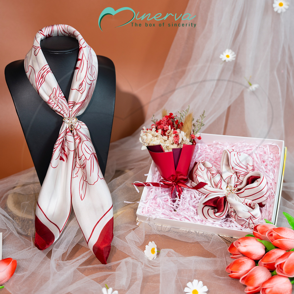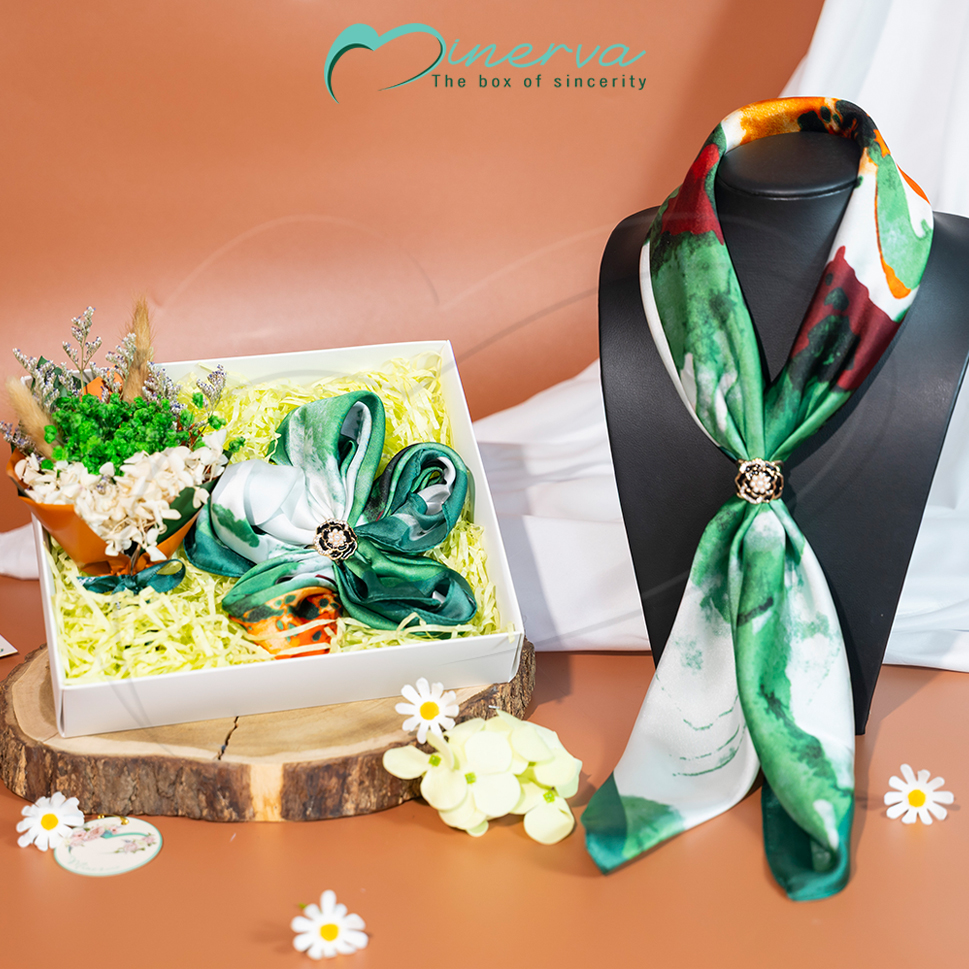 Bên trong set quà là khăn lụa tơ vuông 70x70 mềm mại, thanh lịch, dễ dàng kết hợp nhiều phong cách thời trang khác nhau. Đi kèm là nhẫn cài khăn – một điểm nhấn nhỏ nhưng đủ để tạo nên sự khác biệt tinh tế. Bó hoa khô mini và thiệp chúc giúp lưu giữ thông điệp yêu thương theo năm tháng, trong khi hộp quà và túi đựng được thiết kế trang nhã, đảm bảo ấn tượng ngay từ khoảnh khắc mở quà.