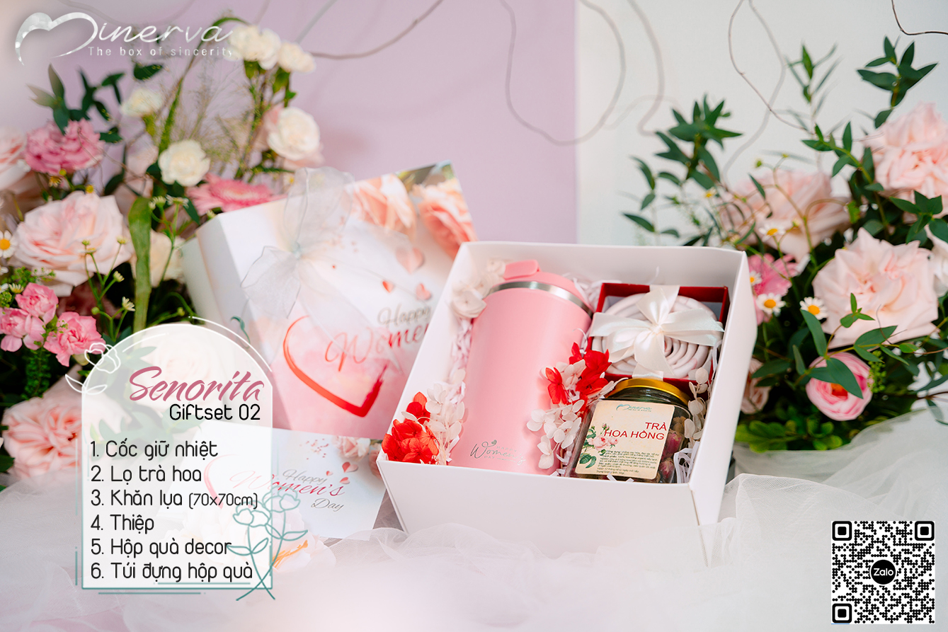 Set quà Senorita bao gồm: trà hoa thiên nhiên, bình giữ nhiệt khắc tên cá nhân hóa và khăn lụa vuông 70x70cm. Đây là sự kết hợp vừa thanh lịch vừa hiện đại, mang đến trải nghiệm quà tặng đầy bất ngờ. Đặc biệt, bình giữ nhiệt có khắc tên giúp món quà trở nên độc đáo, thể hiện sự quan tâm và tình cảm riêng dành cho mẹ.