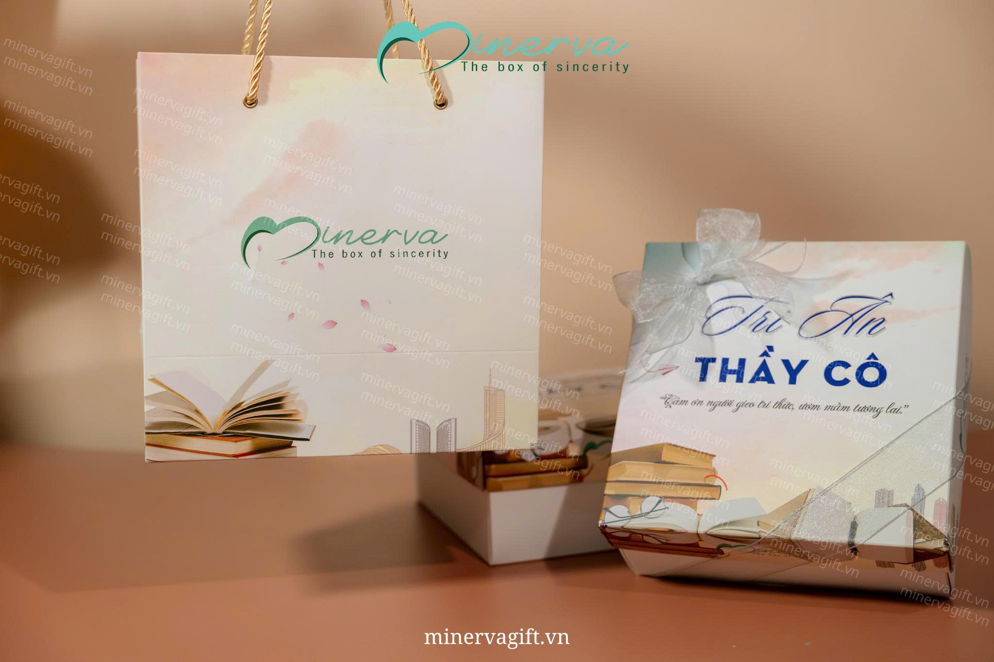 Decor tươi tắn – sống động: Các bộ hộp quà được thiết kế theo chủ đề 20/11 với gam màu sáng, sang trọng, tạo cảm giác trẻ trung nhưng vẫn giữ nét thanh lịch phù hợp với nghề giáo.
