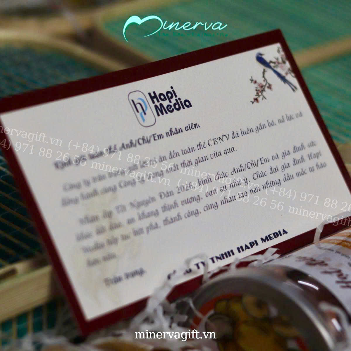 Điểm nhấn đặc biệt của dự án lần này chính là mẫu thiệp được Minerva thiết kế riêng theo nhận diện thương hiệu Hapi Media, in trọn vẹn lời chúc Tết mà Ban lãnh đạo gửi đến toàn thể cán bộ nhân viên: