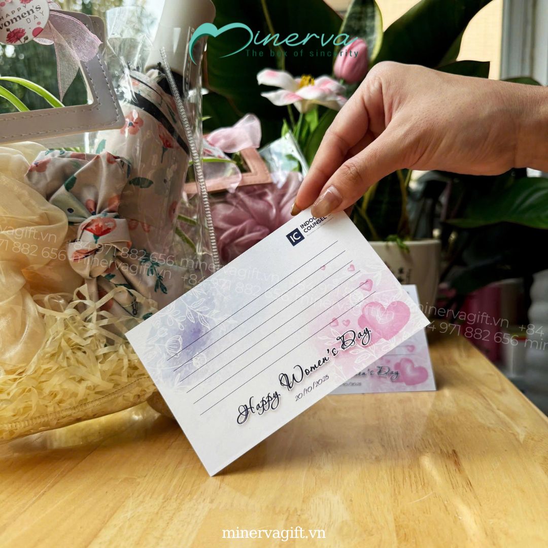 Sự kết hợp giữa thiệp thiết kế riêng của IC và set quà được Minerva hoàn thiện đã tạo nên một tổng thể đồng bộ, trang nhã và giàu cảm xúc – đúng với tinh thần của Ngày Phụ nữ Việt Nam 20/10.