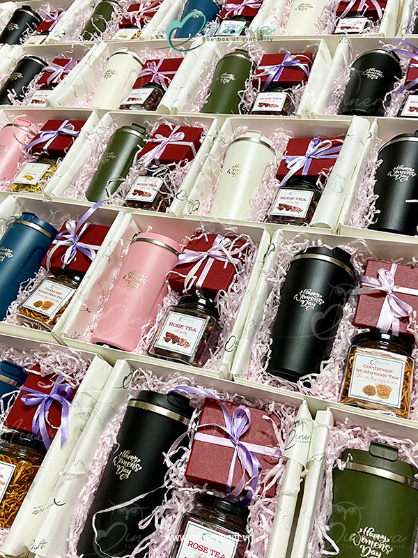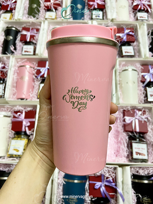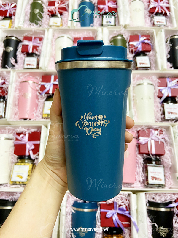 Set quà Decor theo chủ đề Tri ân phụ nữ Việt Nam. Cốc giữ nhiệt khắc Laser text "Happy Women's day" cách điệu.
