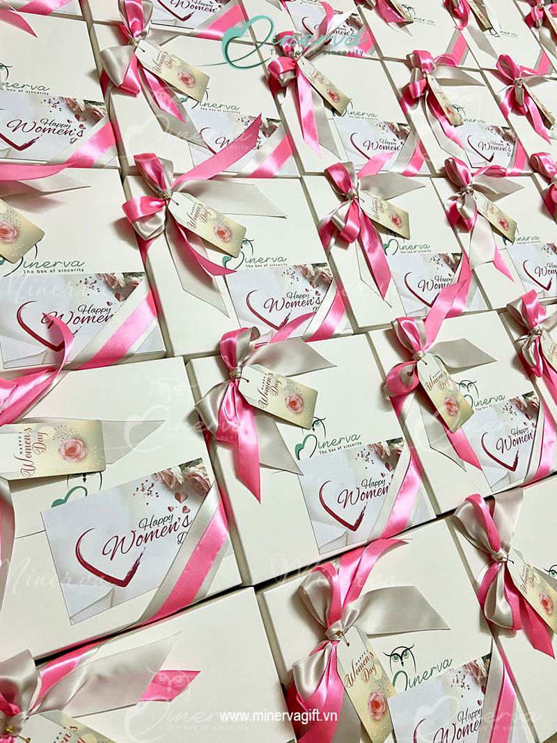 Hộp quà được thắt nơ tone hồng, có thiệp thiết kế, thẻ Tag "Happy Women's day"