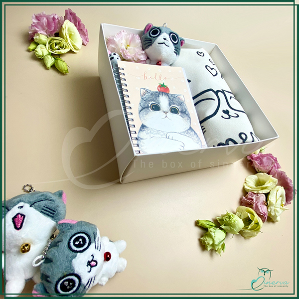 Meow Meow gift box gồm chiếc túi vải mang phong cách Hàn Quốc, sổ tay, bút kim, móc khóa. Một tuyển tập hình chú mèo dễ thương. Các sản phẩm đều rất hữu dụng khi đi học, đi chơi, đi du lịch đều rất phù hợp. Và đặc biệt với team nghiện mèo thì đây đúng là món quà dành riêng cho bạn đó.