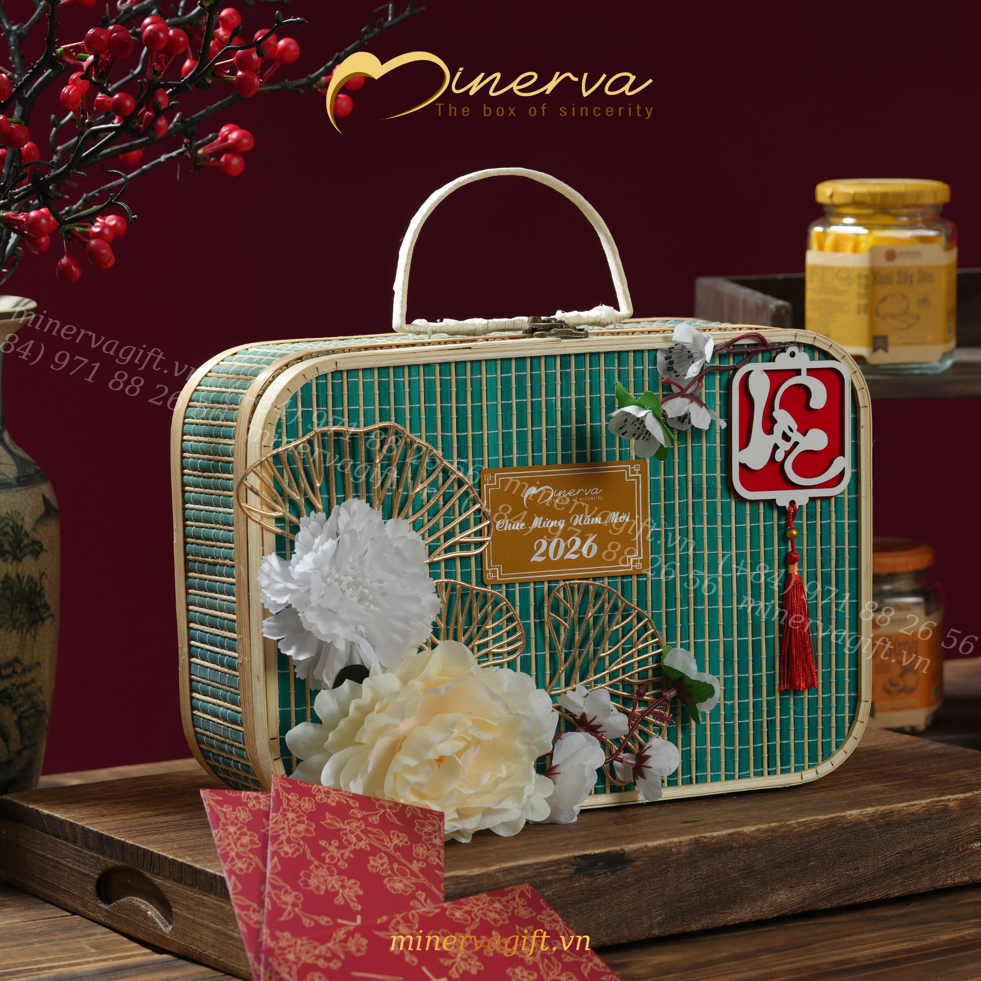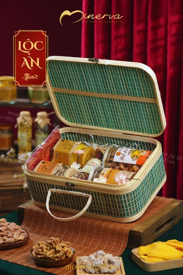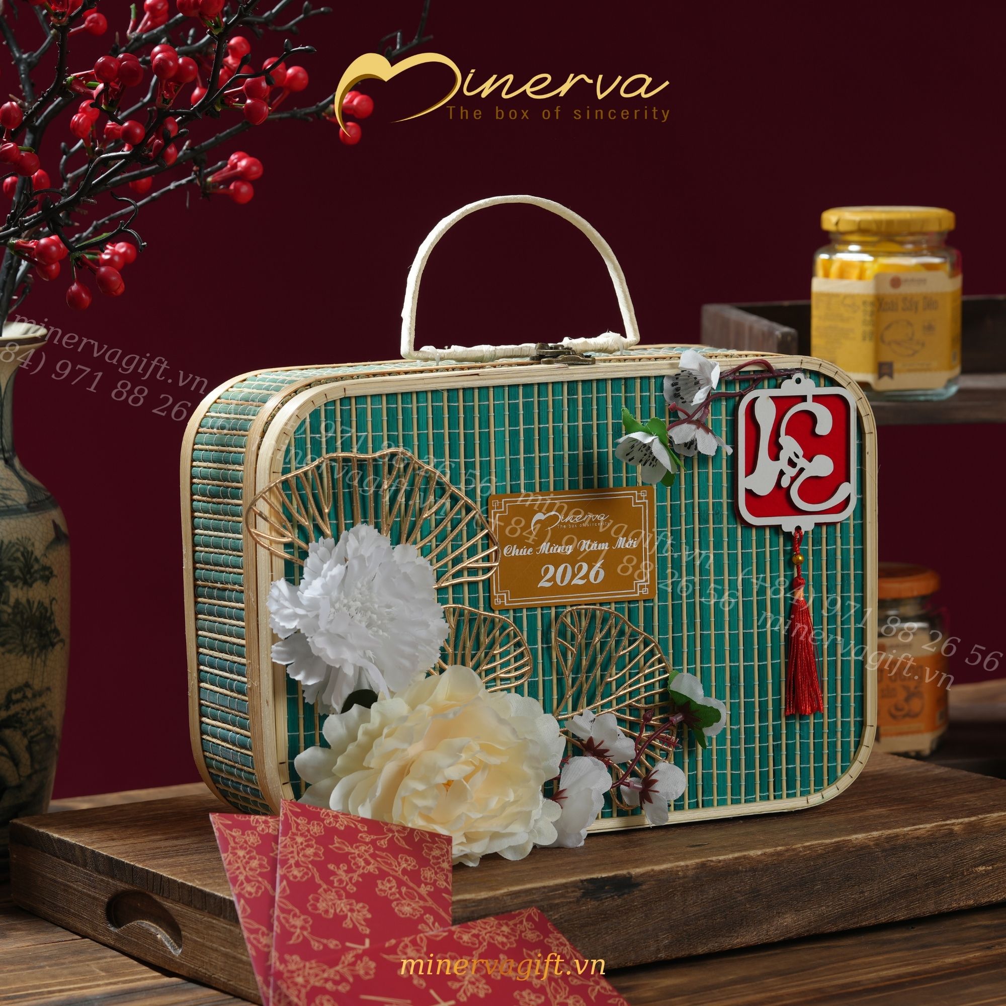 Set quà Lộc An gây ấn tượng bởi sắc xanh ngọc dịu mắt trên nền giỏ tre đan thủ công truyền thống, gợi nhớ đến những ngày Tết xưa mộc mạc mà ấm áp. Hình ảnh giỏ tre quen thuộc, kết hợp cùng cách phối màu tinh tế và decor hoa lụa, tag gỗ trang nhã, tạo nên tổng thể hài hòa giữa nét gần gũi của truyền thống và phong thái sang trọng của quà Tết hiện đại. Từng chi tiết đều được Minerva chăm chút cẩn thận, giúp giỏ quà không chỉ đẹp khi biếu tặng mà còn phù hợp để trưng bày trong không gian ngày Tết, góp phần tạo nên cảm giác ấm cúng và sum vầy.