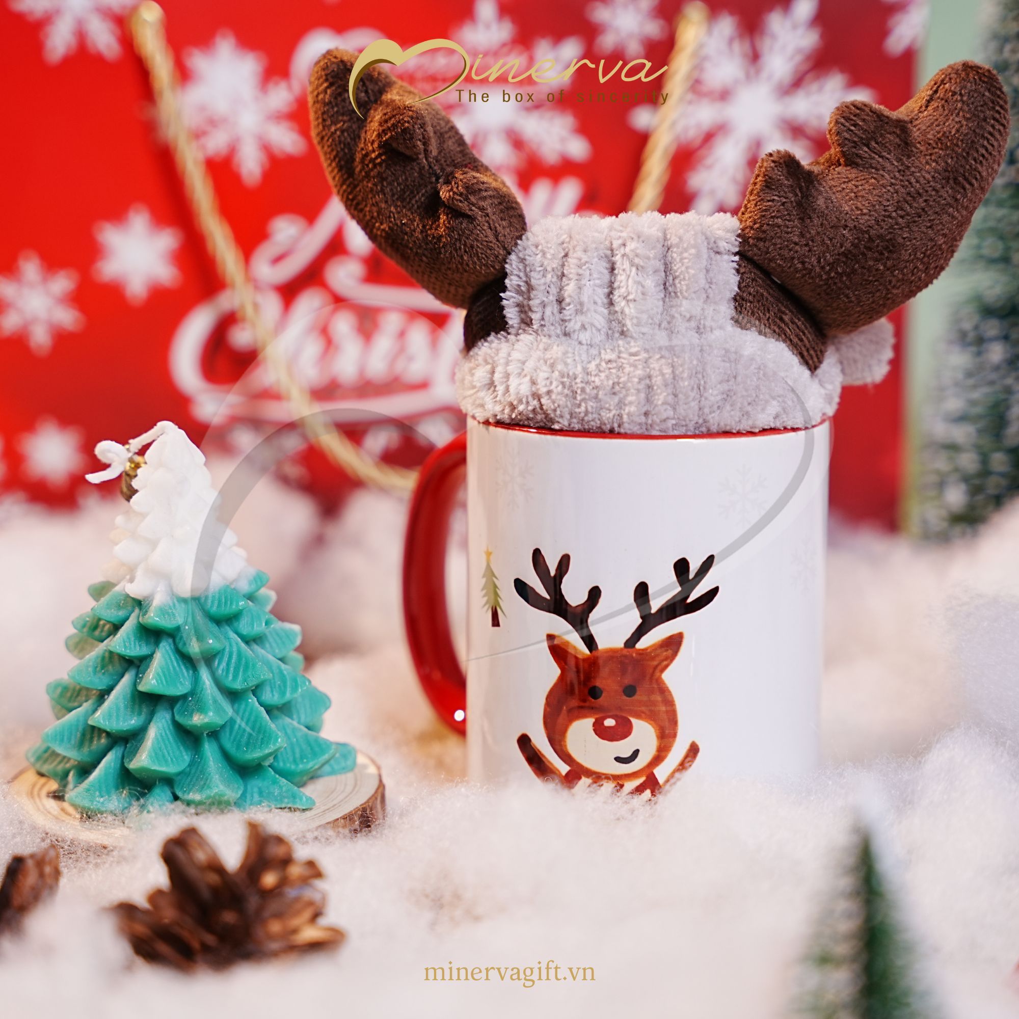 Set quà được Minerva phối hợp tinh tế giữa phụ kiện giữ ấm – decor Noel – và một chiếc cốc sứ họa tiết tuần lộc siêu dễ thương, tất cả được gói trong túi nhựa trong sang trọng, nhìn là mê – tặng ai cũng thích.