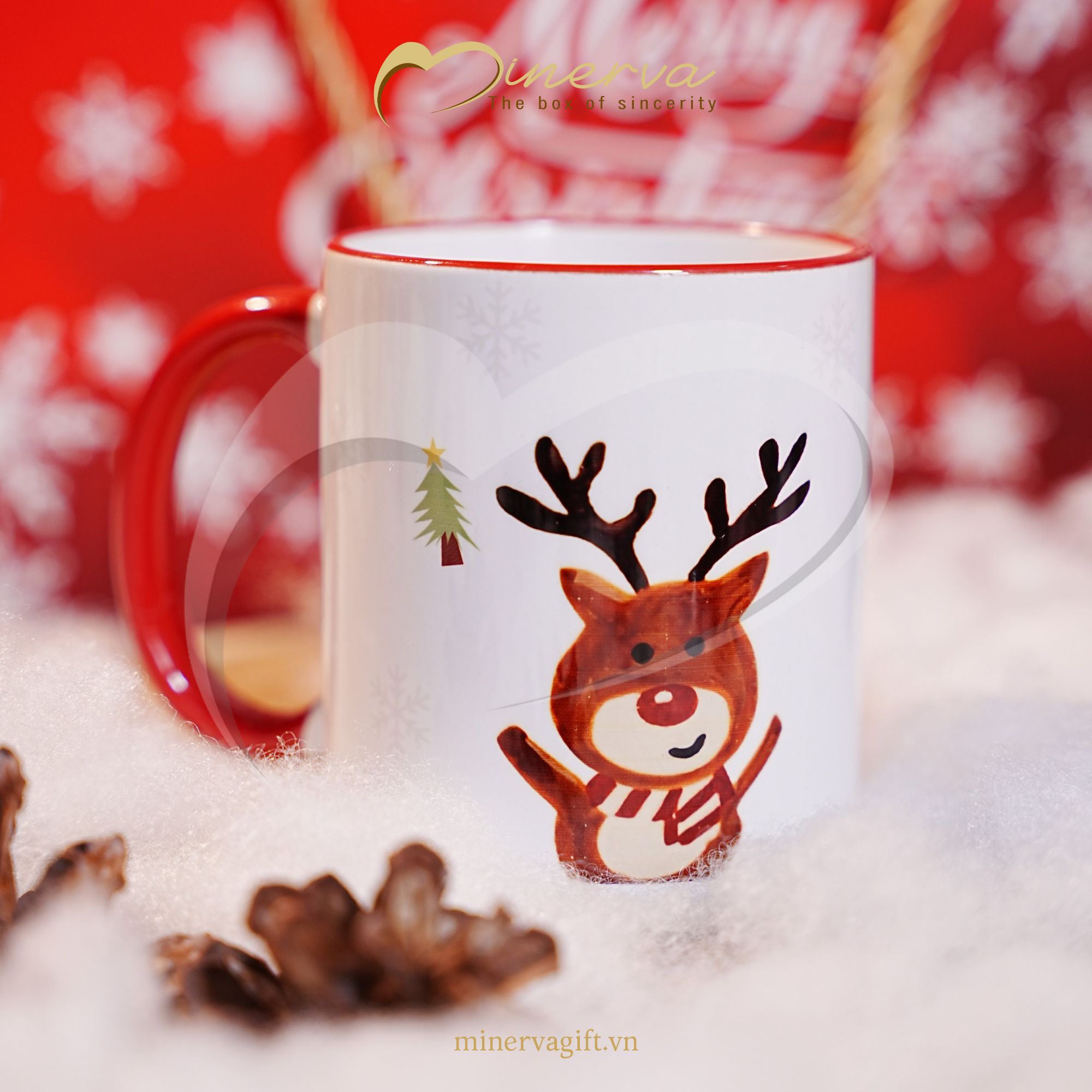 Chiếc cốc sứ tông trắng – đỏ nổi bật, in hình tuần lộc Giáng sinh đầy vui vẻ và đáng yêu. Chất sứ dày, giữ nhiệt tốt, phù hợp dùng uống trà, cà phê, ca cao nóng trong những ngày se lạnh.